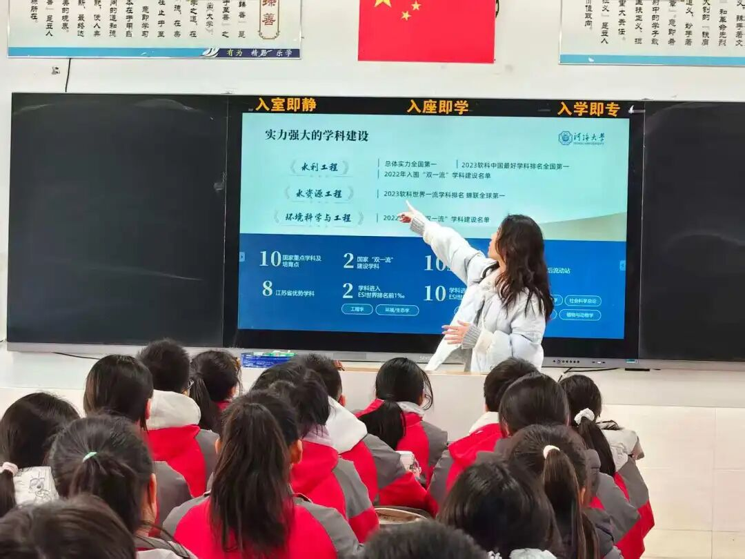 “重返沭如,再聚河海”实践团在和高中相关老师进行交流对接之后开展进班宣讲活动。成员们以多种形式为高三学弟学妹们全方位解锁河海大学。