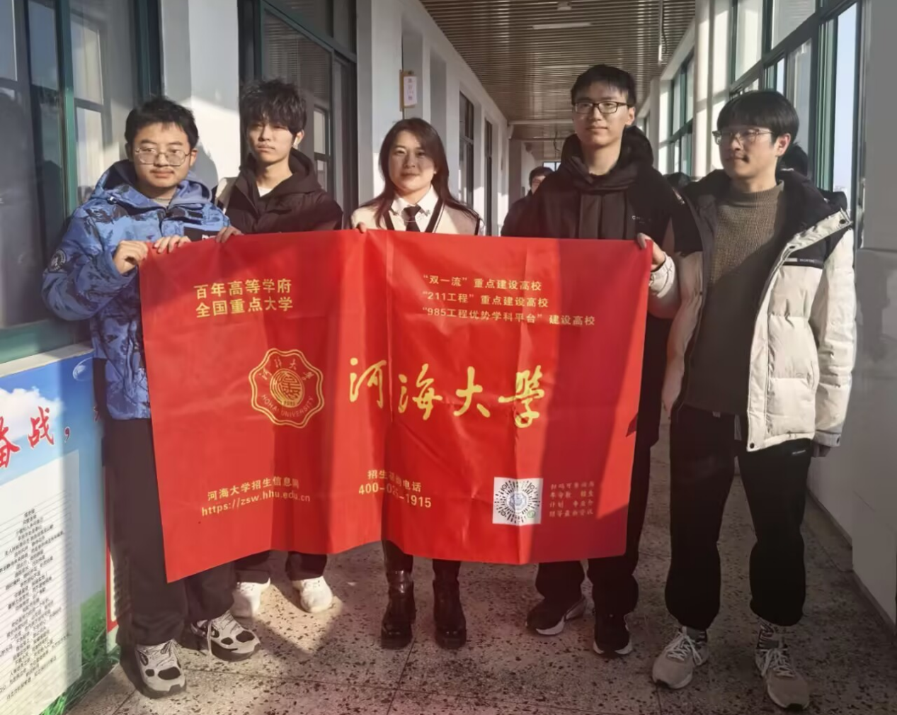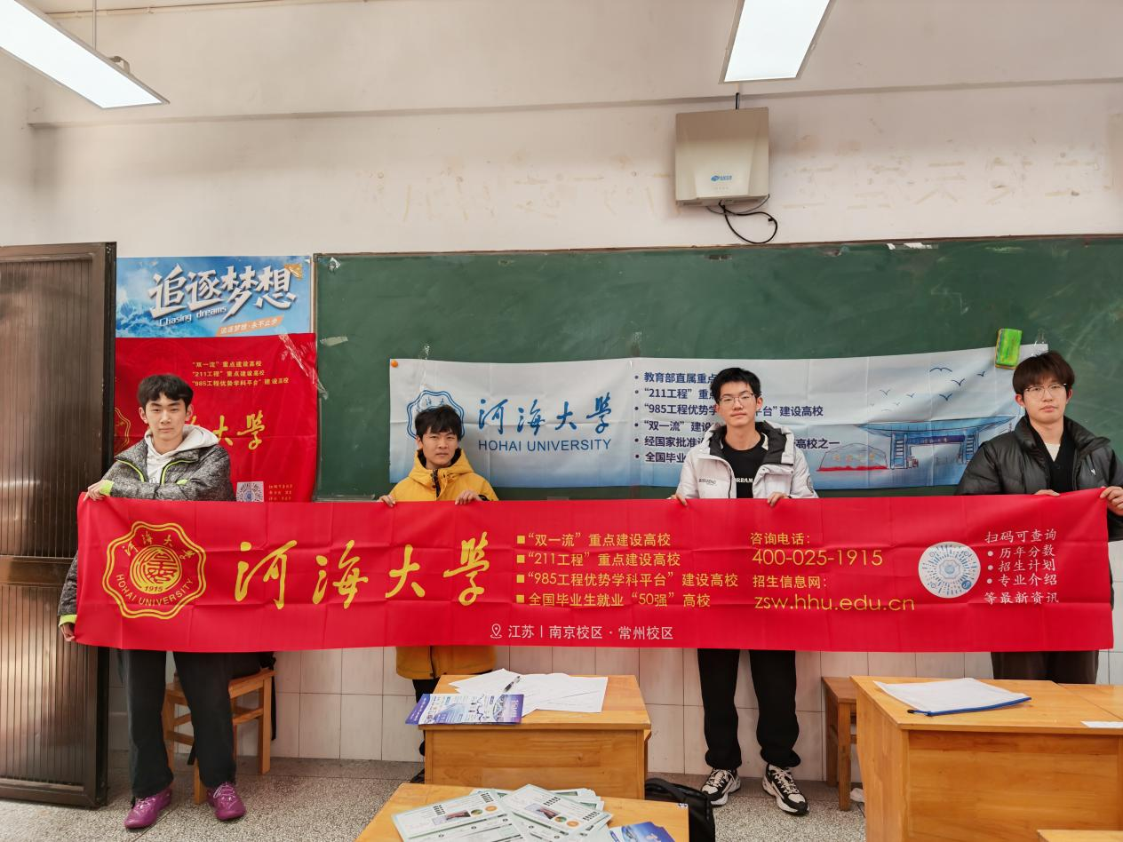2月11日,河海大学“江海溯源”南通中学宣讲团返回母校江苏省南通中学,开展摆摊宣传与进班宣讲联合活动。团队由来自电气、机电、经济、里尔等威尼斯人 的学子跨院组建,前期认真参加培训、对接招生组。队员们首先拜访恩师,汇报大学成长;随后在集中宣讲教室设立咨询摊位,通过队旗、文创与资料吸引大批学弟学妹驻足交流。